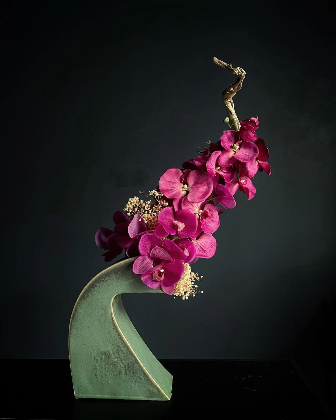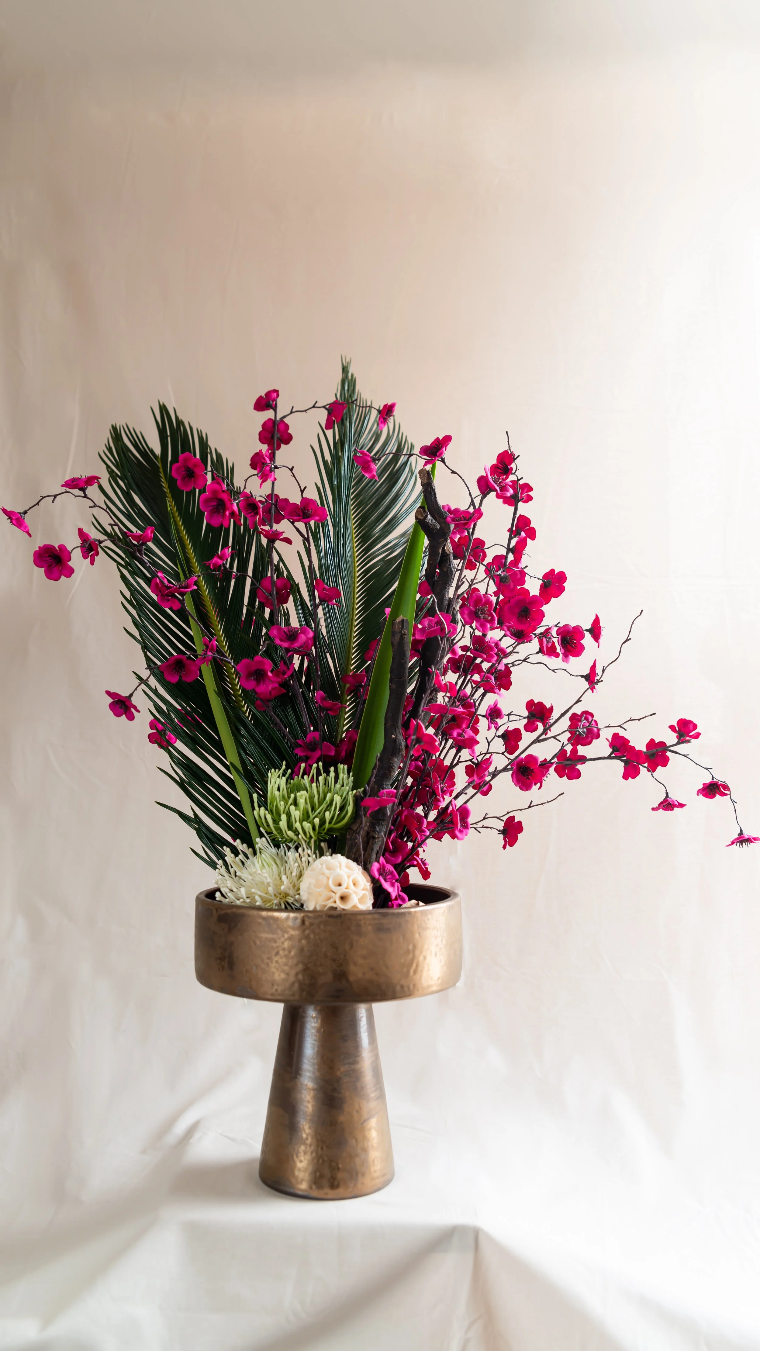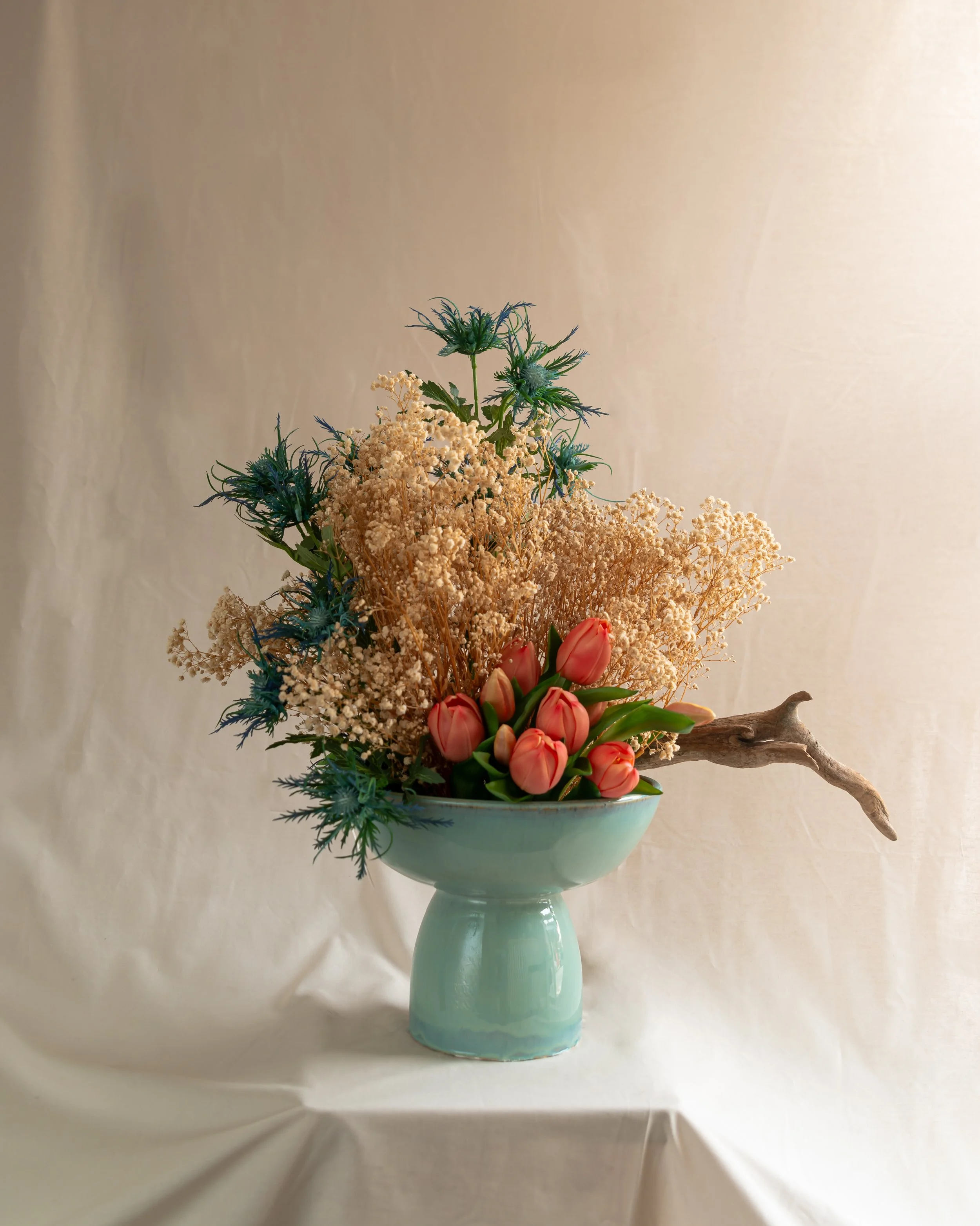 One-of-a-kind ceramic-based botanical artworks for retail, residential, and events, combining fresh, preserved, and silk elements in sculptural balance.